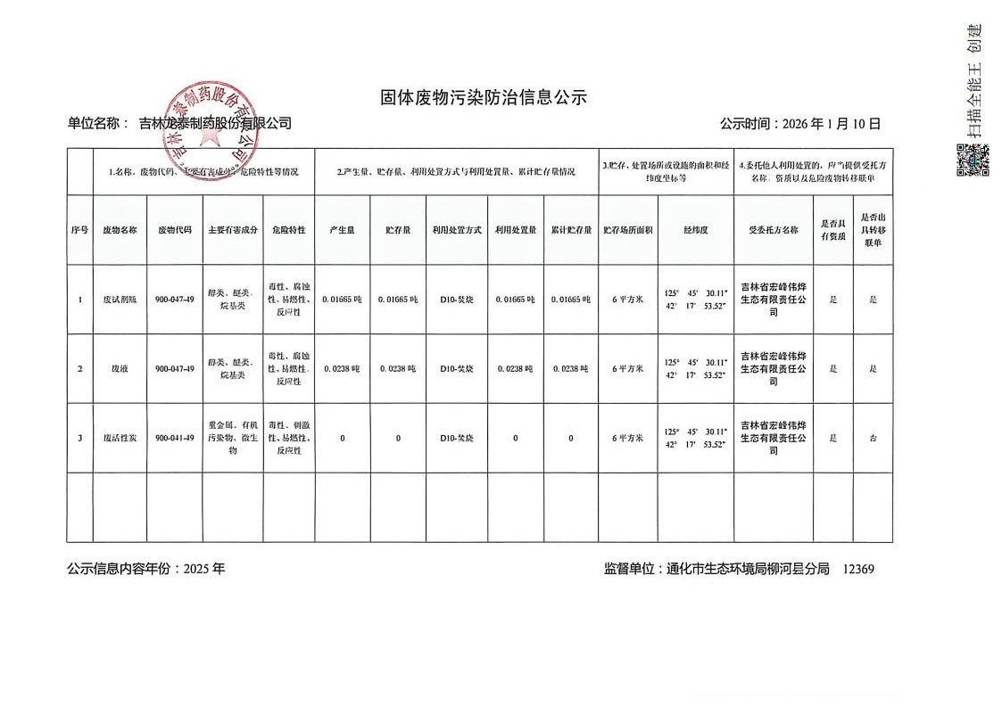 2025年吉林龙泰制药股份有限公司固体废物污染防治信息公示