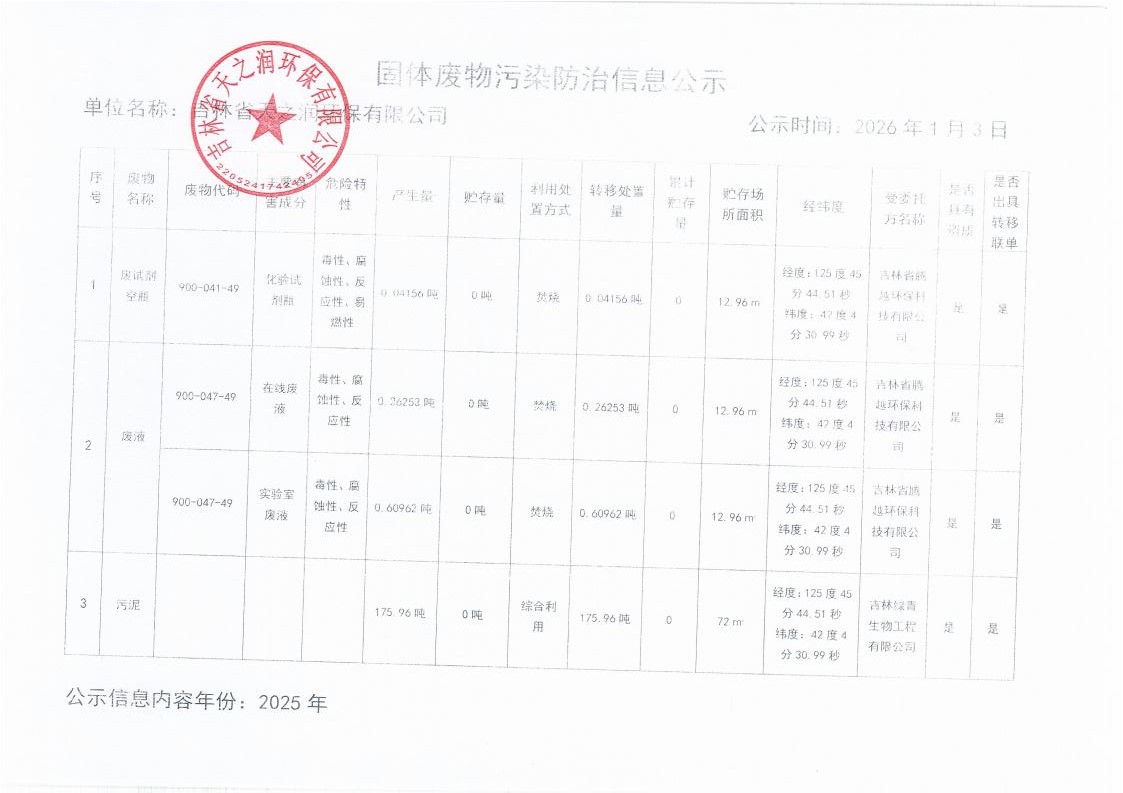 2025年吉林省天之润环保有限公司固体废物污染防治信息公示