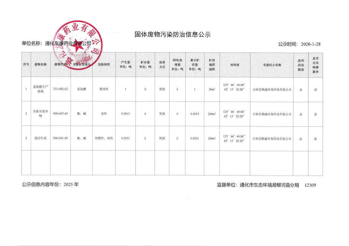 2025年通化友康药业有限公司固体废物污染防治信息公示