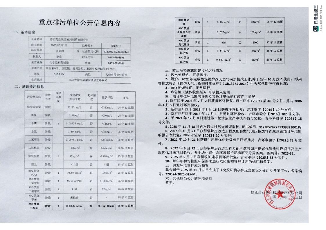 修正药业集团柳河制药有限公司重点排污单位公开信息内容(2016年1月3日)