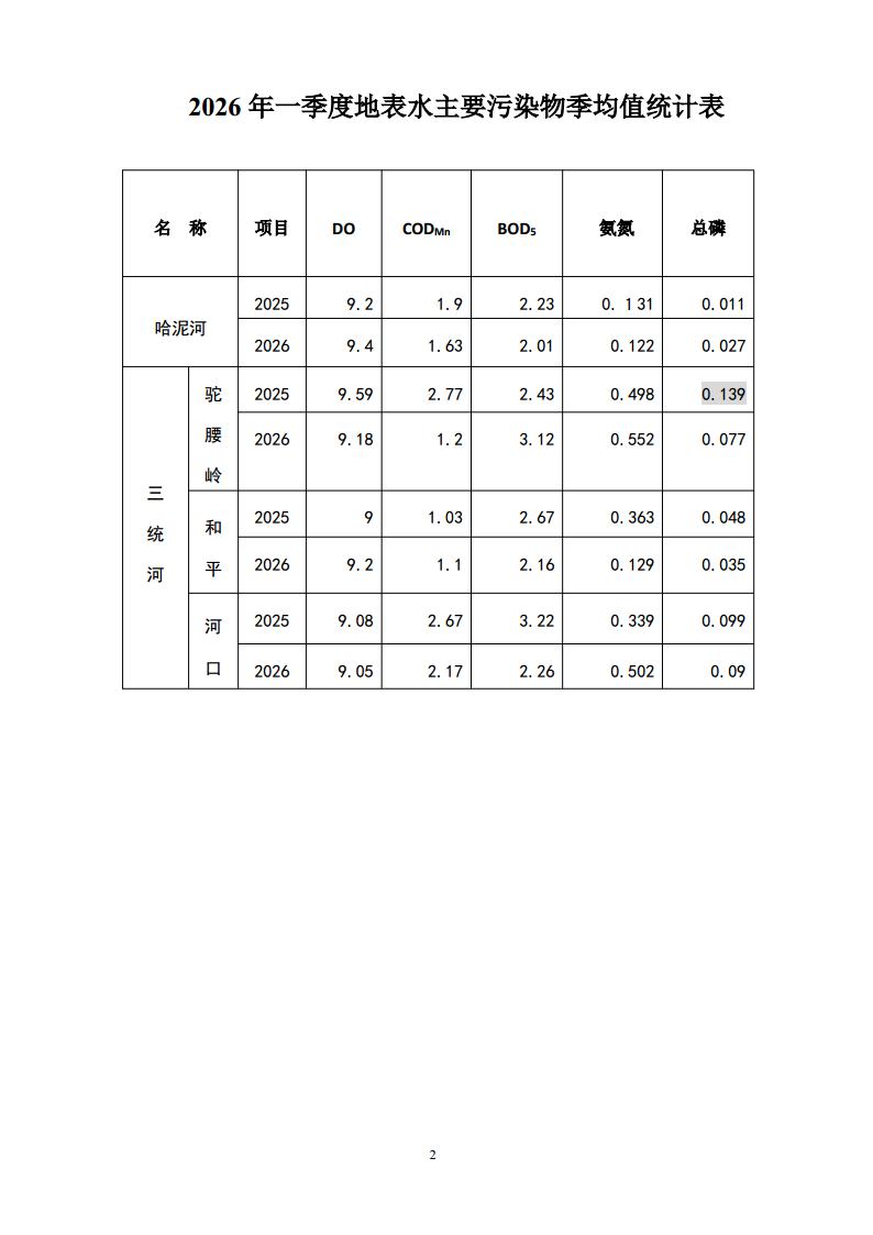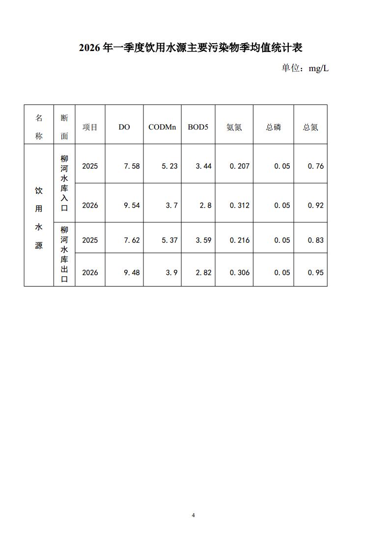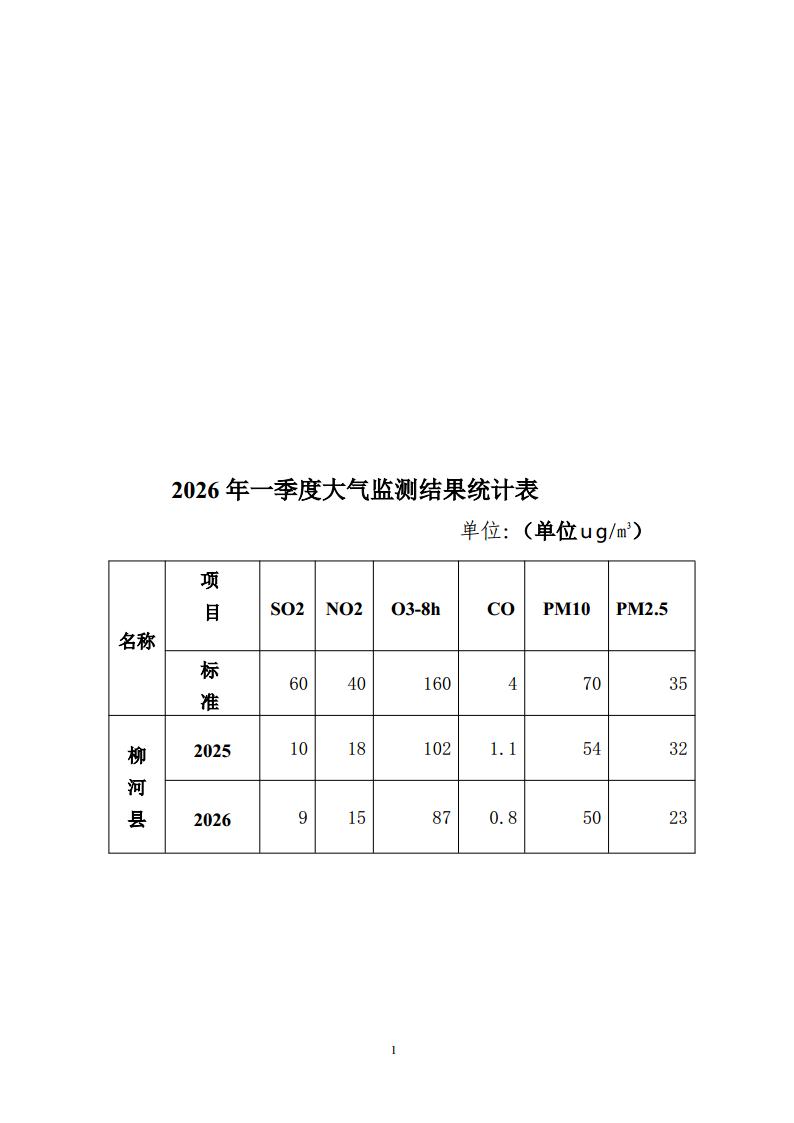 现将2026年一季度柳河县地表水环境质量状况和柳河镇大气环境质量状况公布如下: