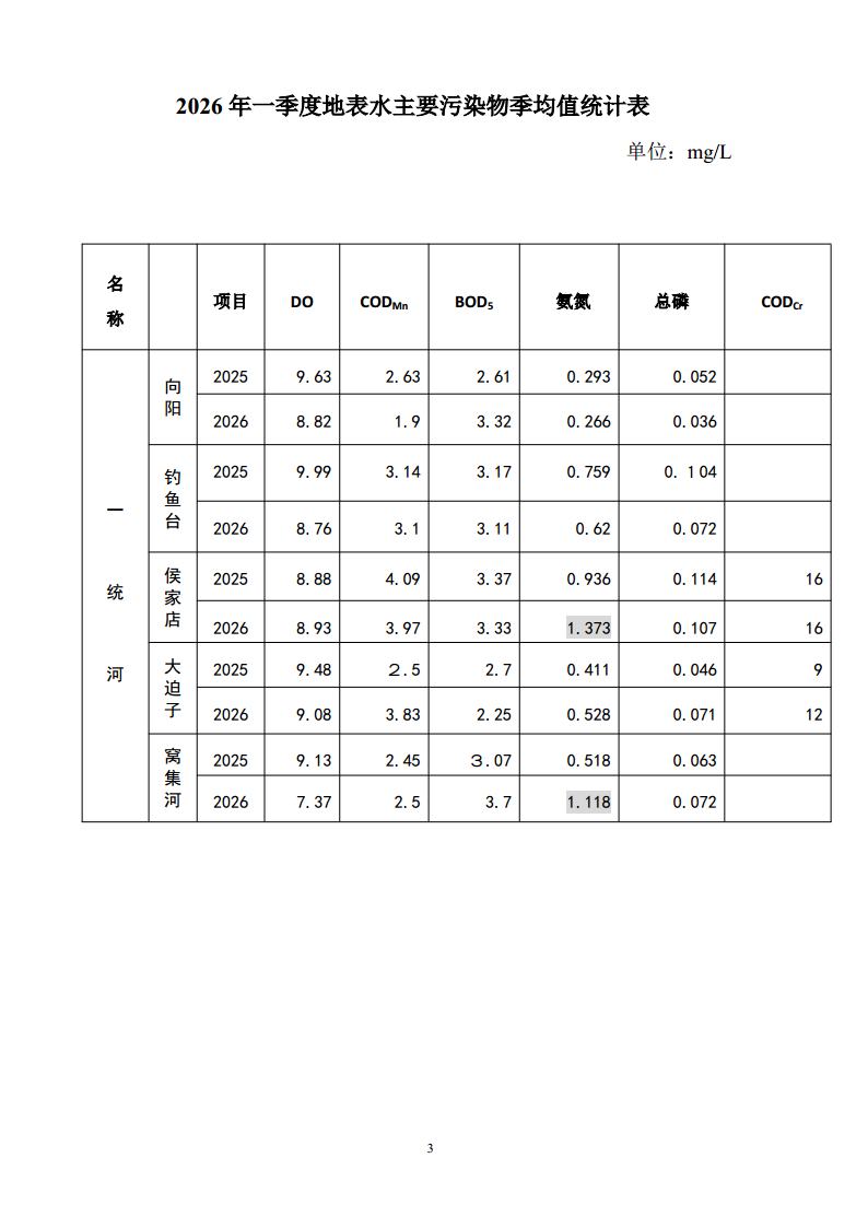 一统河窝集河断面执行地表水环境质量Ⅲ类标准。一季度该断面水质一般,污染项目为氨氮,氨氮均值为1.118mg/L,超过标准11.8%。水质类别为IV类。